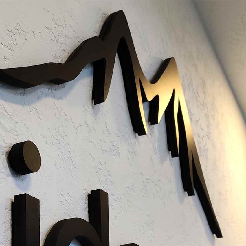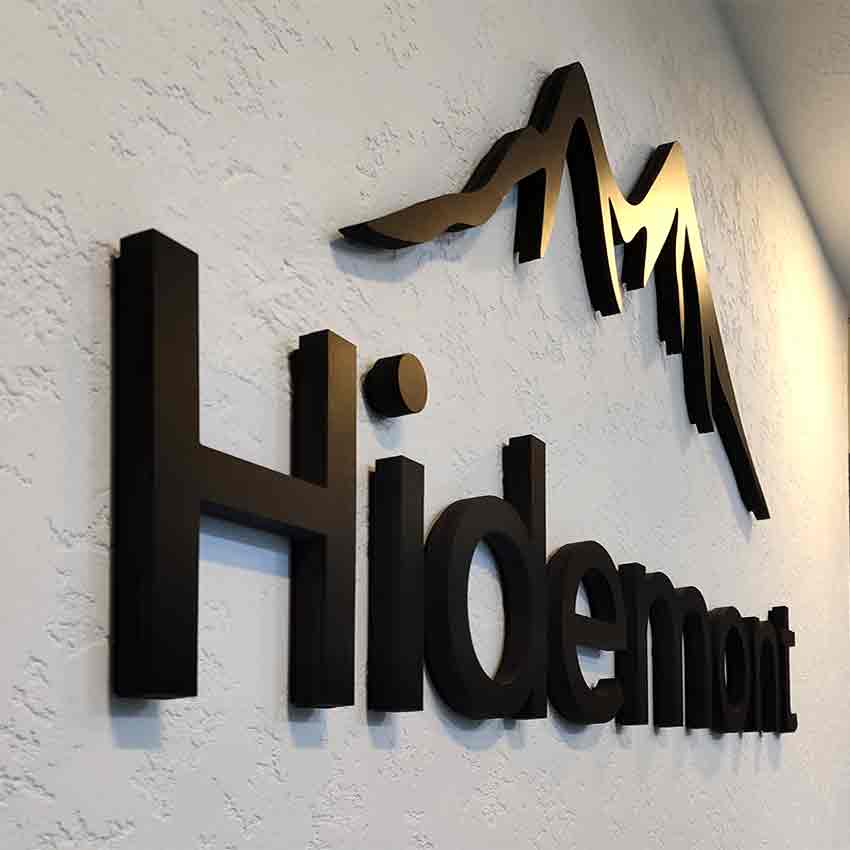Logotyp wnętrzarski Hidemont został wykonany z czarnego, matowego plastiku o grubości 15 mm.